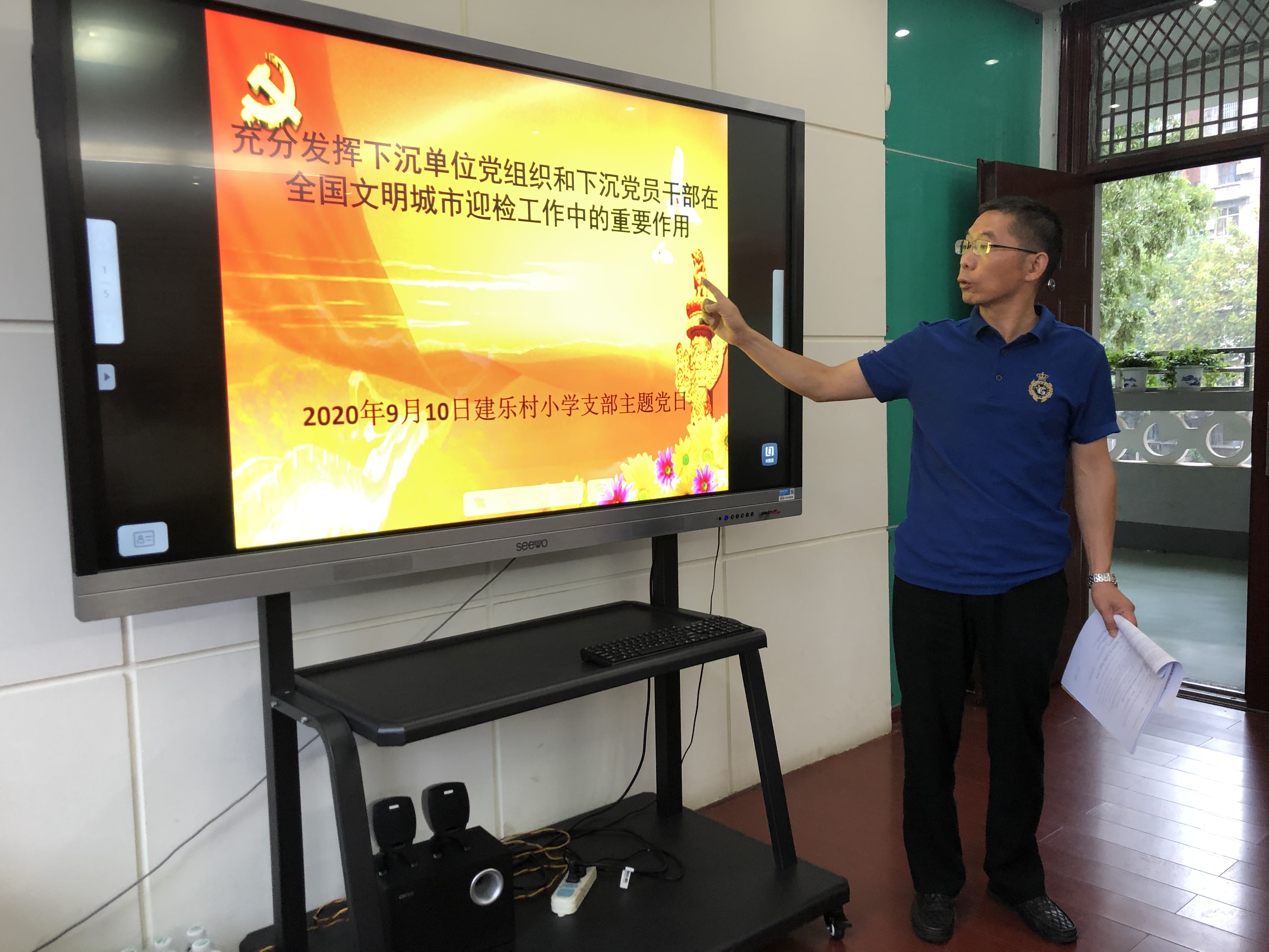 2020年9月10日星期四上午,建乐村小学党支部举行了以“充分发挥下沉单位党组织和下沉党员干部在全国文明城市迎检工作中的重要作用”为主题的党日活动。